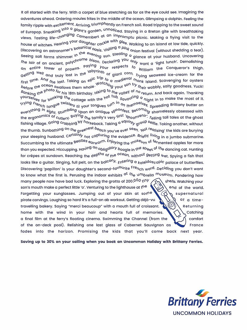 - The campaign concludes with a clear call-to-action: “Saving up to 30% on your sailing when you book an Uncommon Holiday with Brittany Ferries.”
