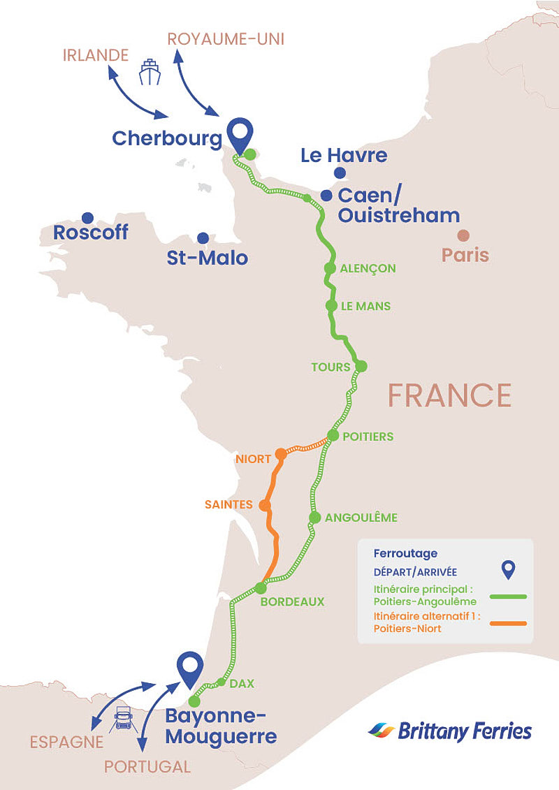 It links Cherbourg to Mouguerre (south-west France), enabling intermodal freight between Spain, Ireland, and the UK.
