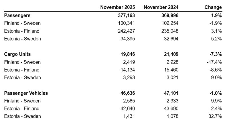 AS Tallink Grupp transported 377,163 passengers in November 2025, up 1.9% year-on-year.