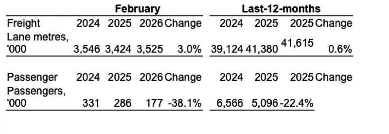 - Total freight volumes reached 3.5m lane metres, +3.0% vs February 2025 (+1.6% adjusted for route changes).