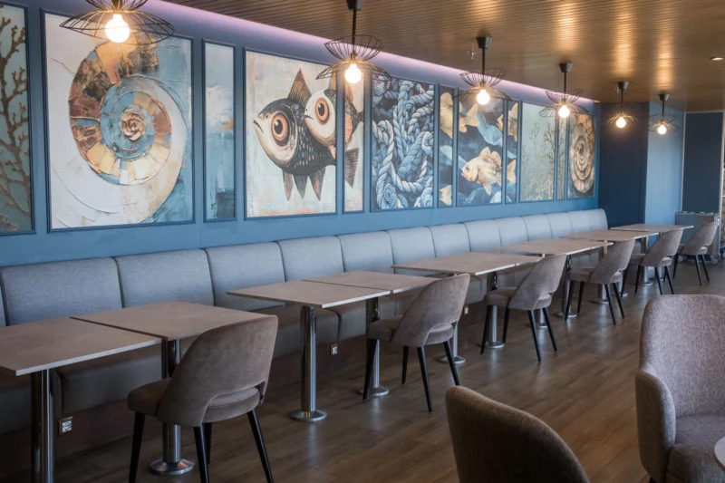 The Vista Lounge now features soft seating and sea-view sofas, while the Café & Terrace area has been updated with new furniture, sheltered teak decking, and a refreshed menu. Interiors have been redesigned with soft blues and natural wood finishes for a calm, seaside feel.
