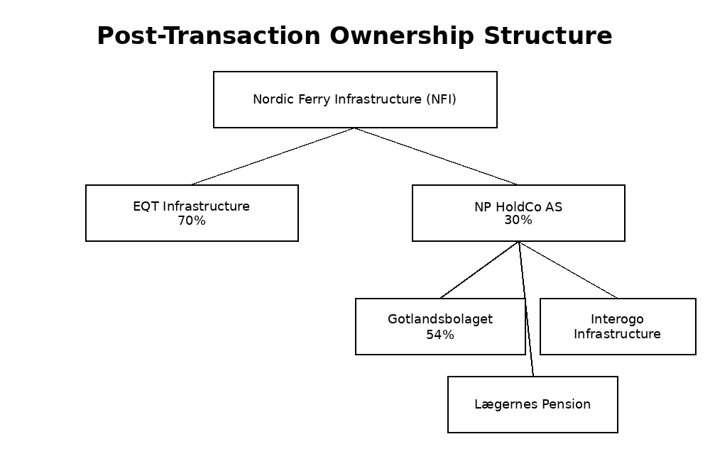 Gotlandsbolaget, together with Interogo Infrastructure and Lægernes Pension, has agreed to acquire a 30% stake in Nordic Ferry Infrastructure (NFI) for approximately €510 million (≈ SEK 6 billion). The investment is made via newly established NP HoldCo AS.