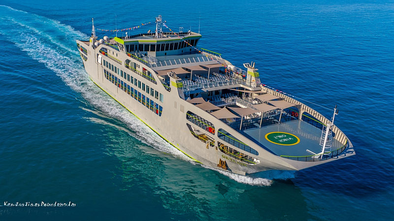 Built in Greece in 2025, she carries 1,000 passengers and 160 cars and operates at 13 knots.