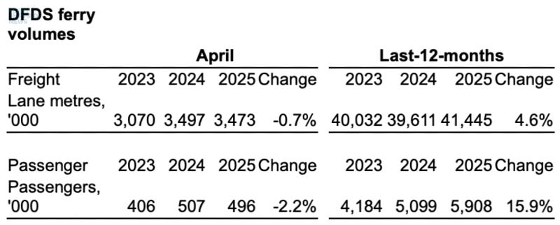 For the last twelve months 2025-24, the total transported freight lane metres increased 0.1% to 41.5m from 41.4m in 2024-23 and decreased 2.1% adjusted for route changes.