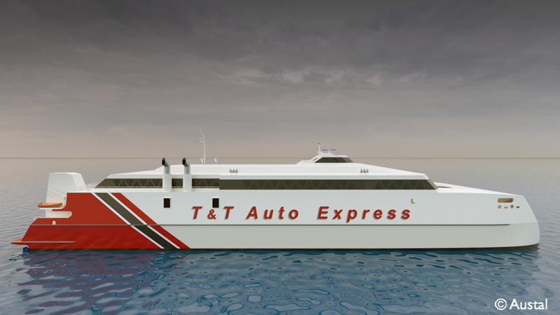 The 94m AutoExpress is designed to carry 926 passengers and 250 cars at speeds of 37.5 knots and will operate a daily service between the islands of Trinidad and Tobago.