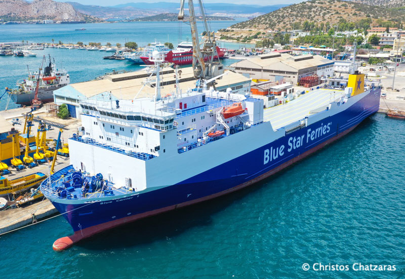 Last night, Blue Star Ferries’ new acquisition BLUE CARRIER 1 (13.073gt/2000) began her first commercial trip from Keratsini.