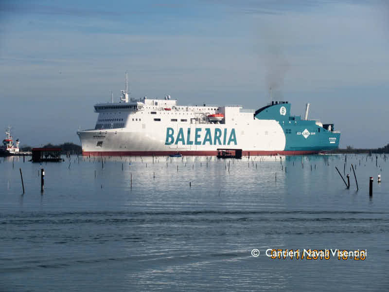 Baleària’s first of two LNG-dual fuel ro-pax ferries left the shipyard Cantiere Navale Visentini and is now in dry dock at the port of Trieste for the final works before the final sea trials scheduled for the next weeks.