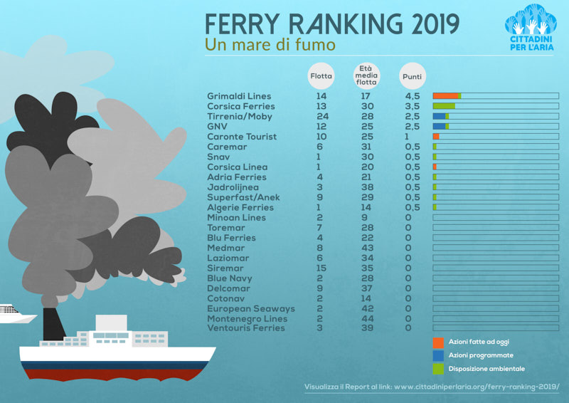 Citizens for air asked the ship-owners operating maritime passenger transport and ro-pax in Italy, what actions are taking or planned to improve the environmental performance of their fleets. The resulting analysis is included in a report (in Italian) highlighting criticalities and possible solutions.