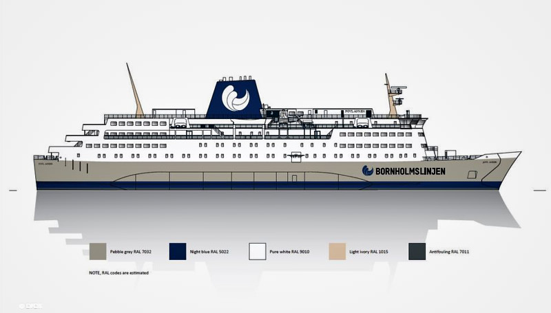The idea is to bring back the grandeur of POVL ANKER by painting her in the original colours of 1978, when she was delivered. The funnel will wear the Molslinjen logo though, not the DSB black and red colors.