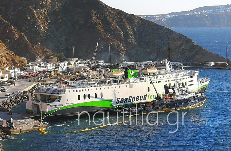 The damaged ferry has been removed from the port of Santorini by the Spanopoulos Group’s tug CHRISTOS XXVIII, which transferred her at Neorion (Syros).