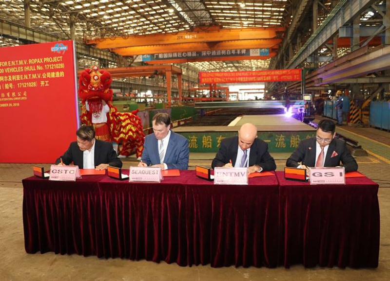 The building of ENTMV / Algérie Ferries’ new ro-pax has officially started after Wang Yanzhong (China Shipping Trading Co.), Jan Andersson (CEO Seaquest), Captain Ayed Abdeselam (ENTMV) and Zhou Xuhui (Guangzhou Shipyard International) signed the last documents.